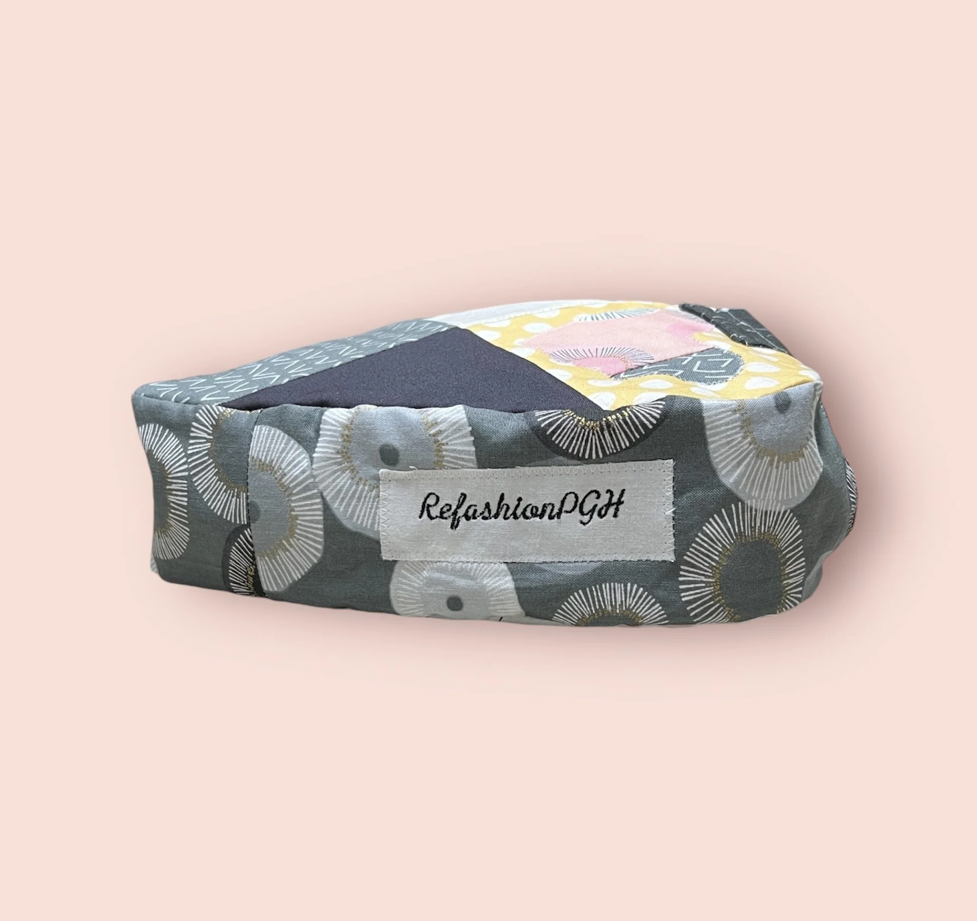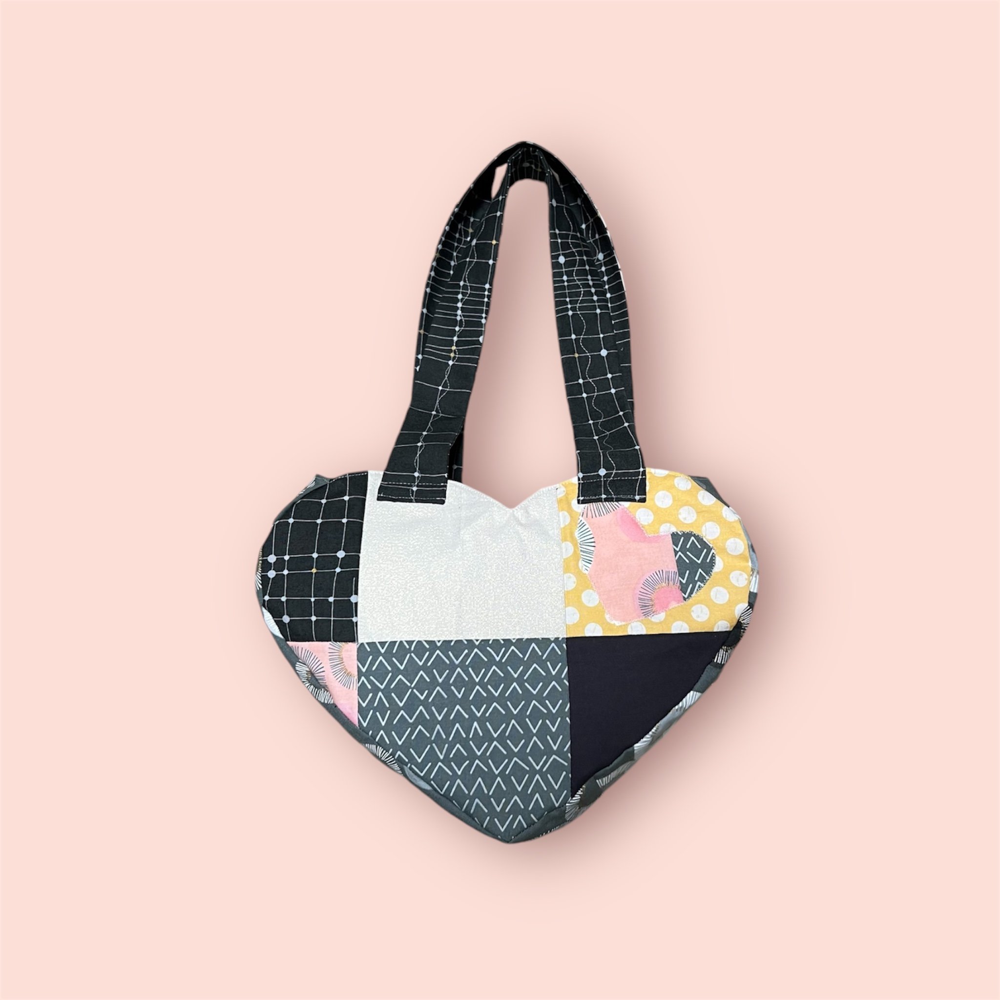 Bright and cheerful with a commitment to sustainability, our latest collection highlights eco-friendly designs that make a statement. This vibrant purse features a playful pattern of three hearts, crafted from recycled cotton fabric in shades of pink, yellow, and gray.